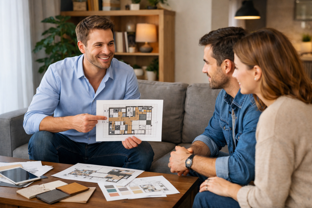 Nous transformons vos idées en plans détaillés et en visualisations 3D afin que vous puissiez découvrir votre futur intérieur avant même sa réalisation. Nous étudions chaque élément avec soin pour optimiser l’espace et harmoniser les volumes. Cette étape permet d’ajuster les détails et de valider toutes les options avec précision.
